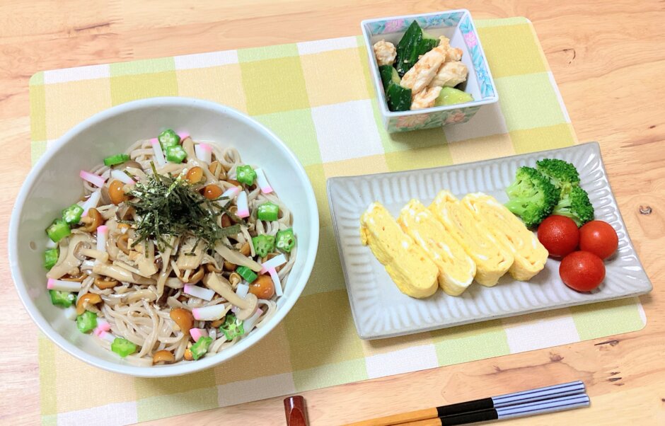 冷たいきのこそばと鶏ささみときゅうりの梅和えの完成です!
