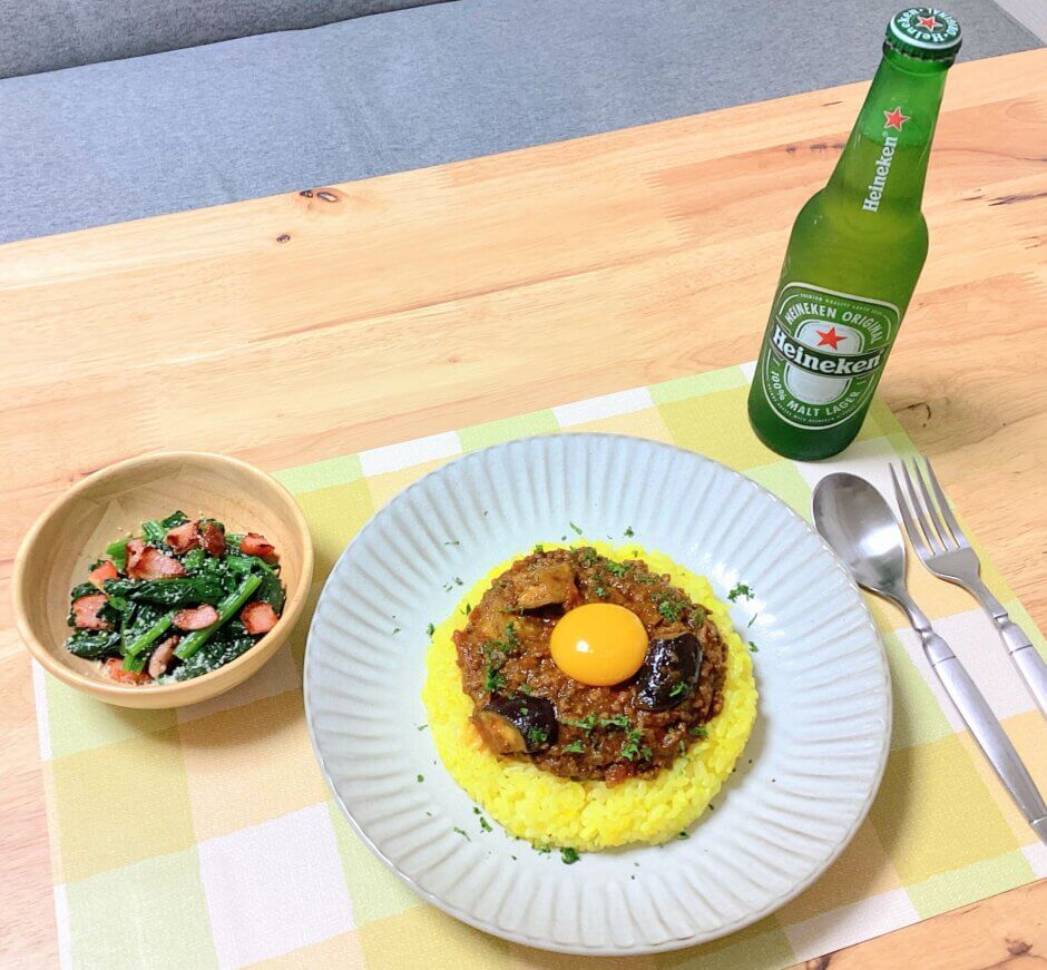 キーマカレー&ベーコンとほうれん草のサラダの完成です!